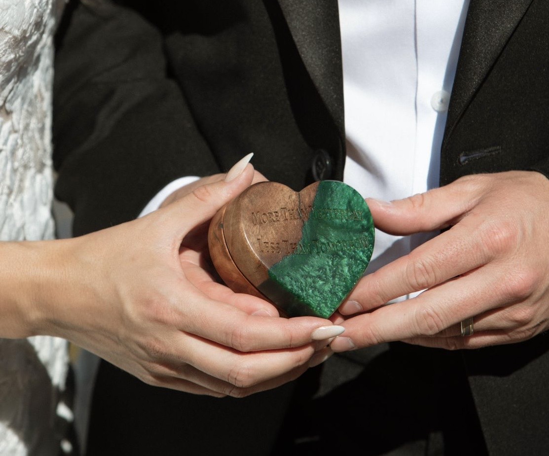 The heart-shaped wood and resin cast is a beautiful fusion of natural wood and glossy resin, creating a unique and sentimental piece that radiates warmth and elegance.
